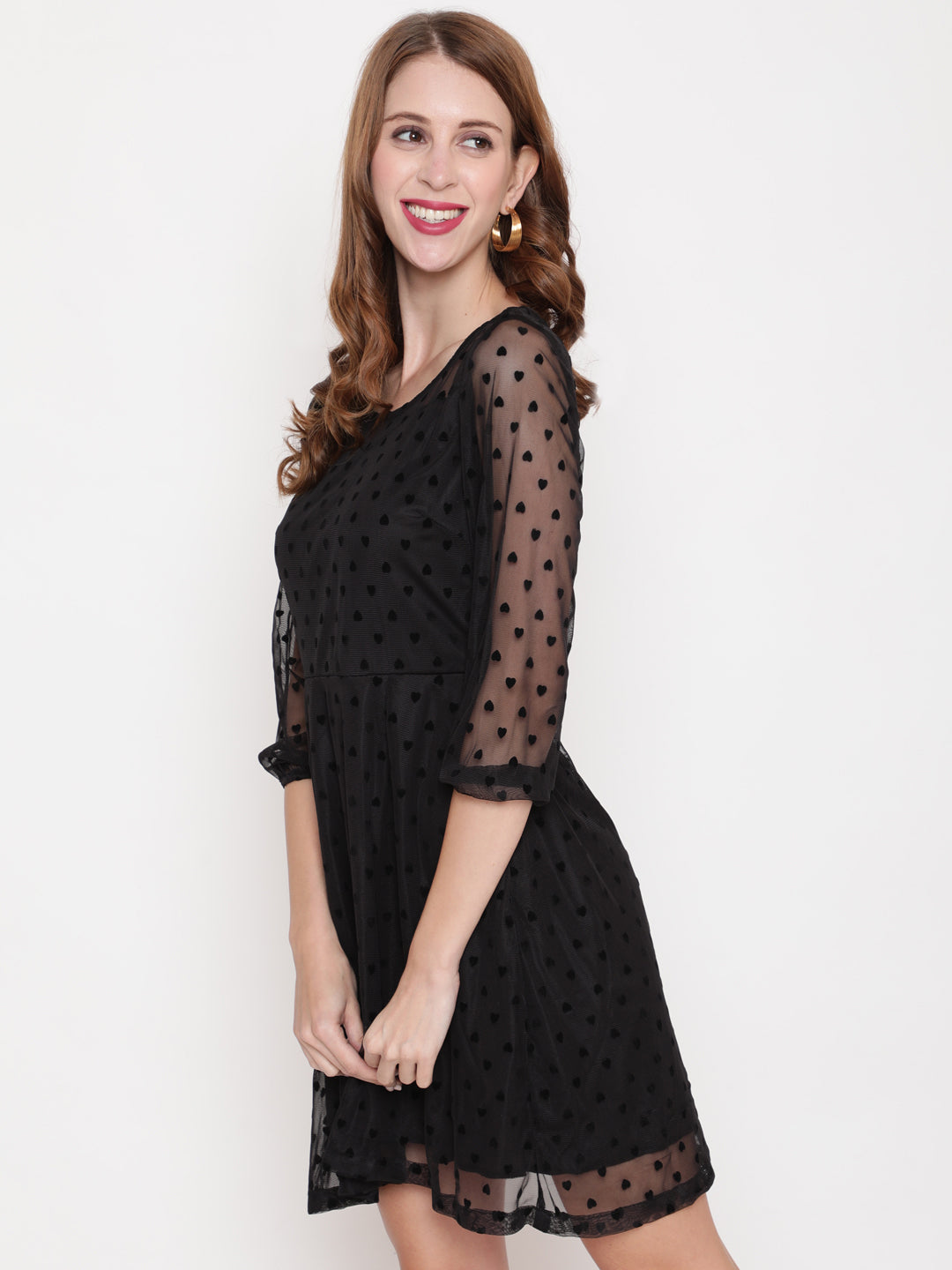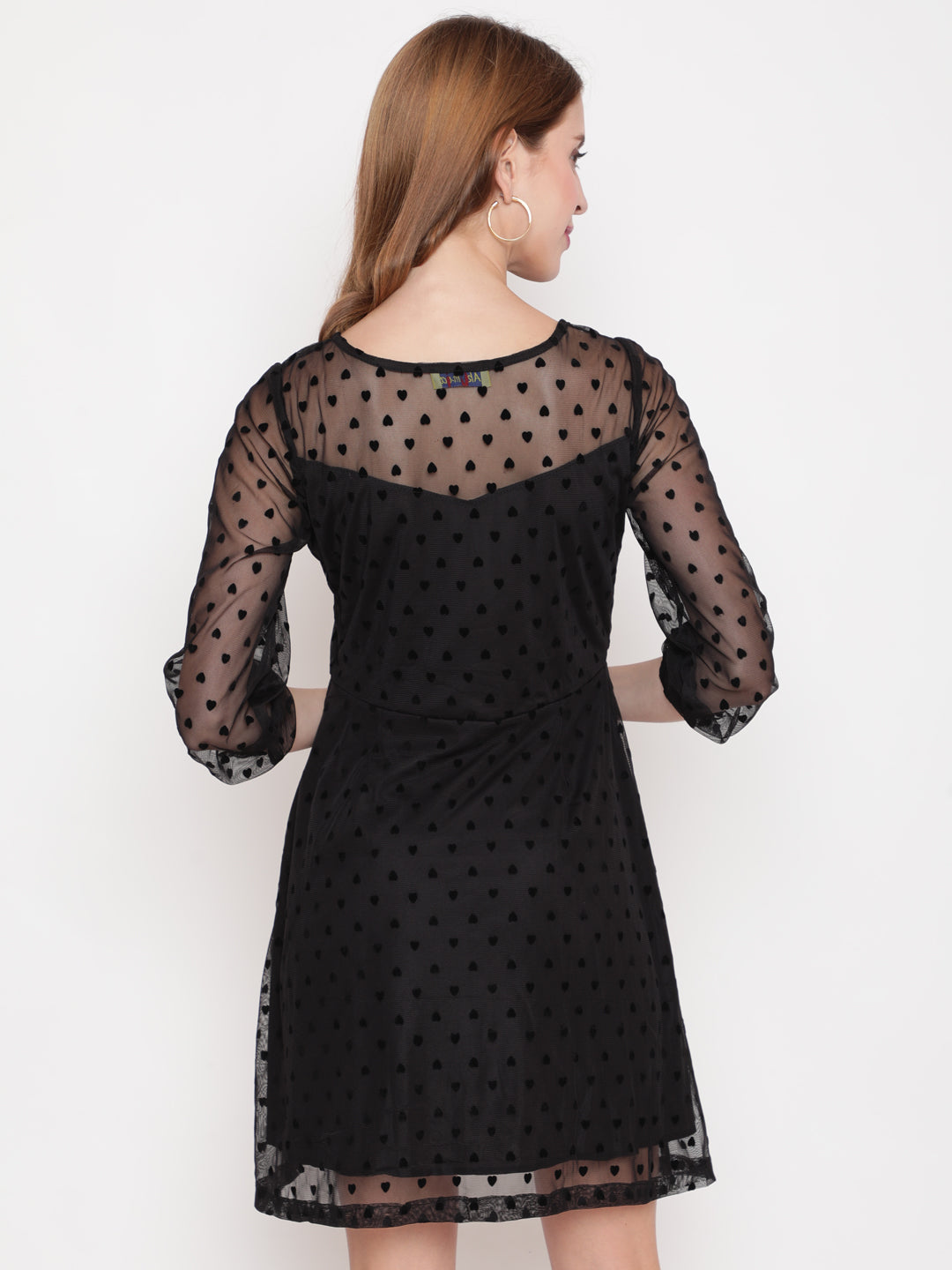 The highlight of this dress is its delicate self-design flocking pattern on sheer net fabric, which adds texture, depth, and a luxurious feel. The classic black color enhances the overall elegance, making it perfect for evening parties, cocktail events, festive occasions, or special celebrations. The net overlay lends a soft, dreamy appeal while maintaining a refined and polished finish.