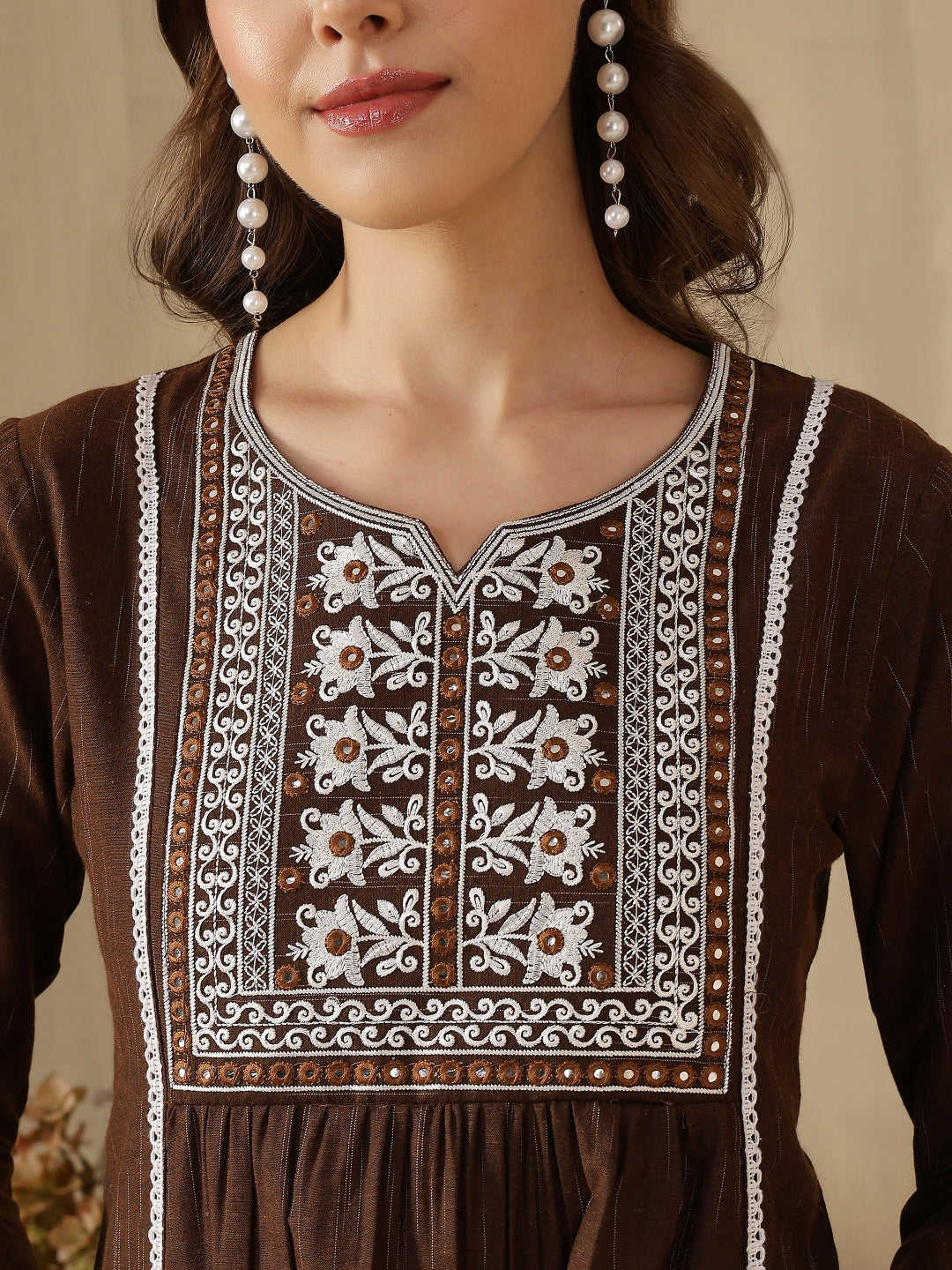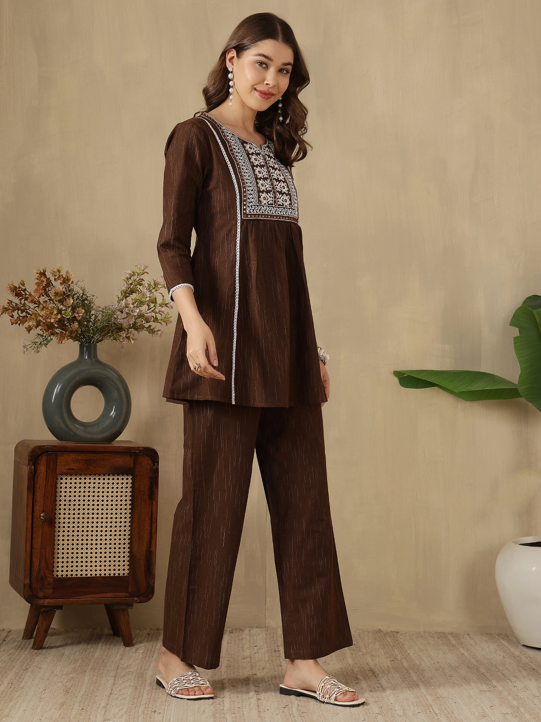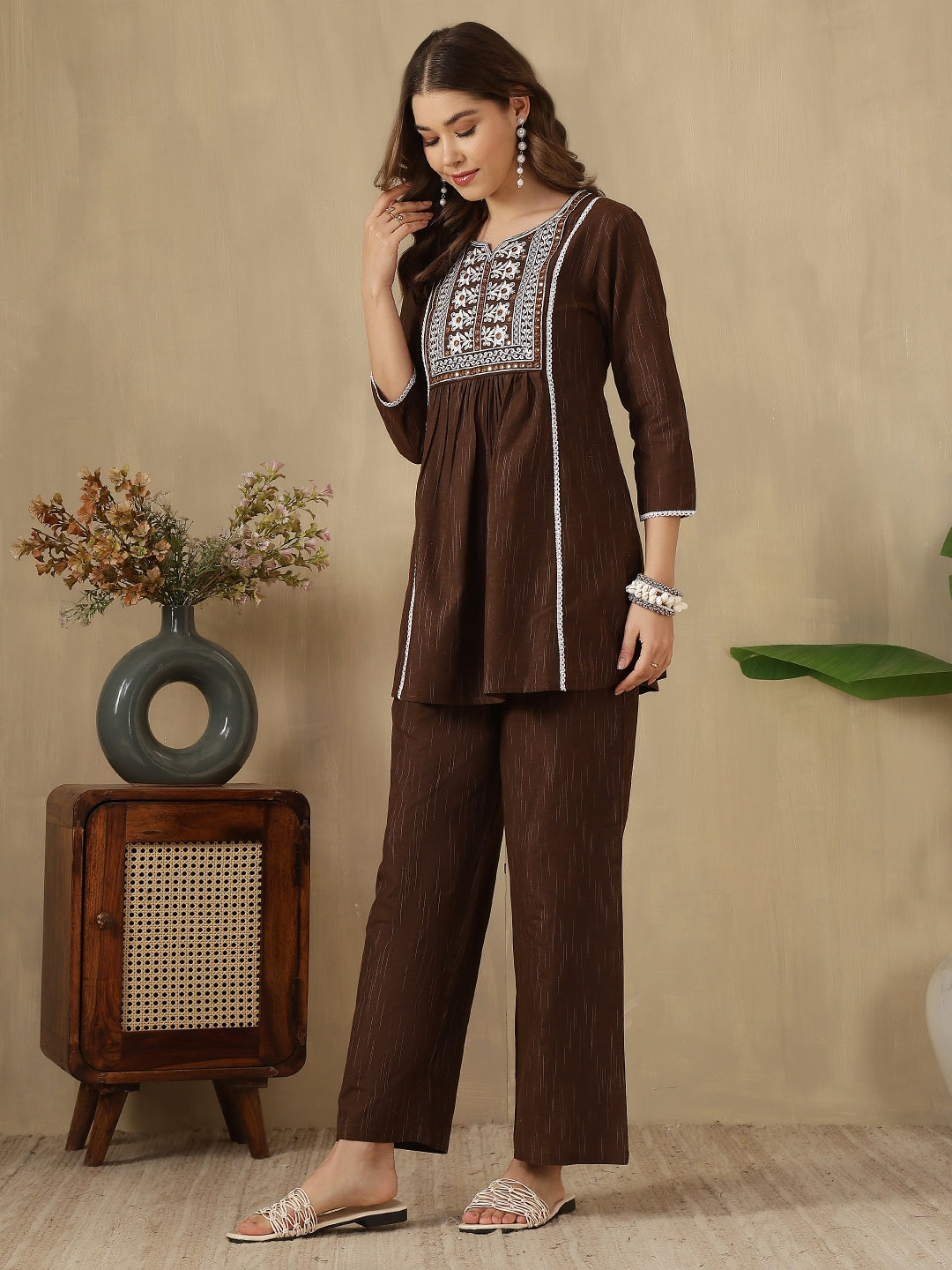 Coffee Brown Embroidered Peplum Style Khadi Co-ord Set