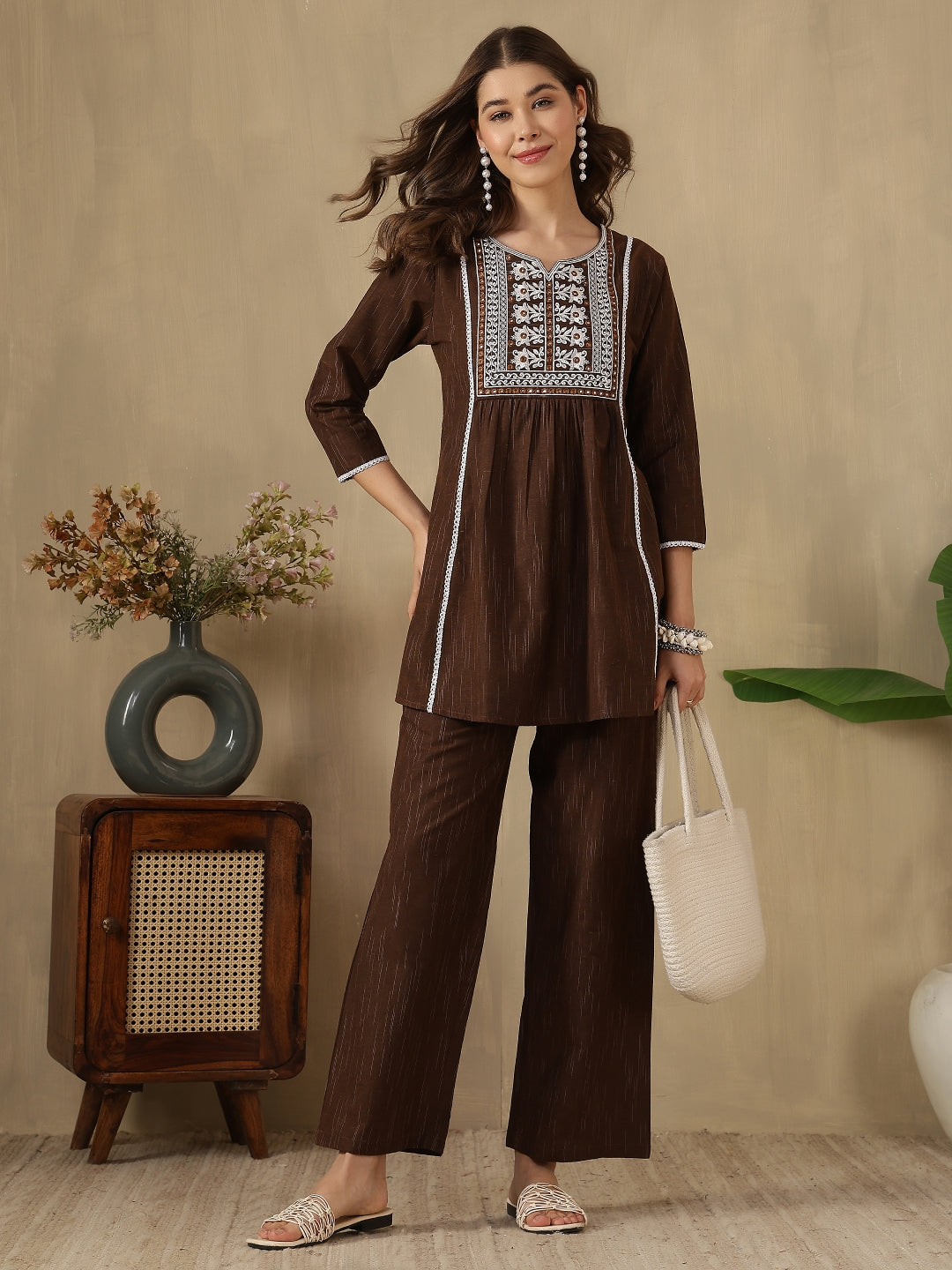 Elevate your everyday style with the Coffee Brown Embroidered Peplum Style Khadi Co-ord Set from Akimia. Designed with elegant embroidery and a flattering peplum-style top, this outfit offers a perfect mix of comfort and modern fashion. The breathable khadi fabric and 3/4 sleeves make it ideal for warm days, while the straight-fit trousers provide all-day comfort and ease. Perfect for casual outings, brunches, travel, and summer styling.
