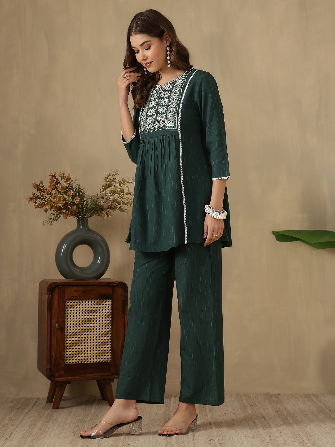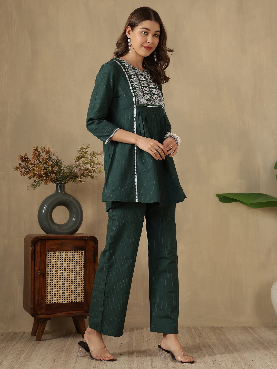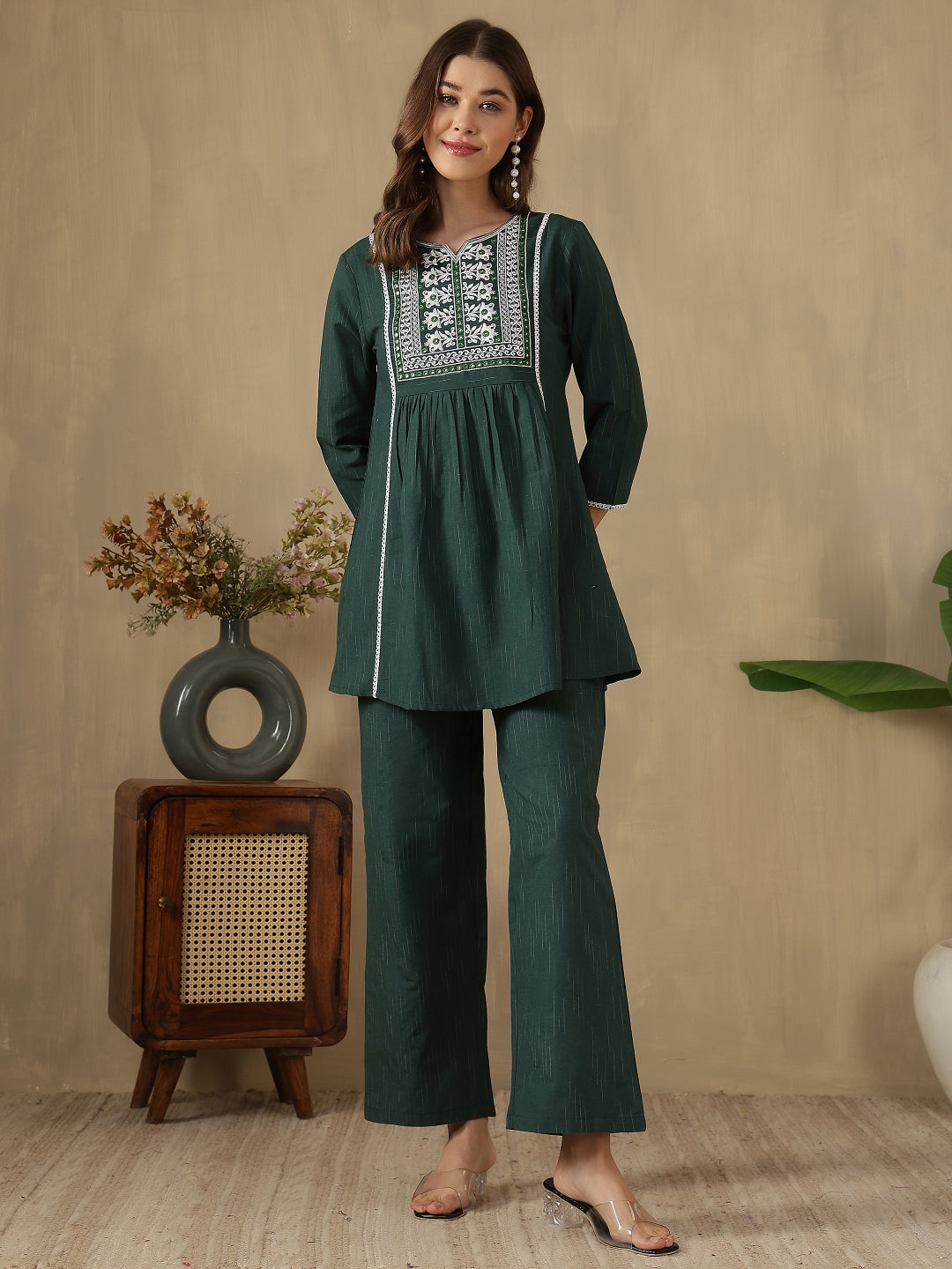 Step out in effortless style with the Green Embroidered Peplum Style Khadi Co-ord Set from Akimia. Crafted with elegant embroidery and a flattering peplum-style top, this outfit brings a perfect blend of comfort and contemporary fashion. The breathable khadi fabric and 3/4 sleeves make it ideal for warm days, while the straight-fit trousers ensure all-day comfort and ease. Perfect for casual outings, brunches, travel, and summer styling.