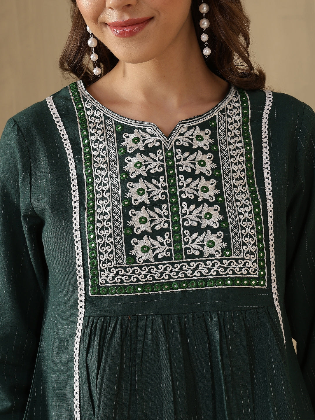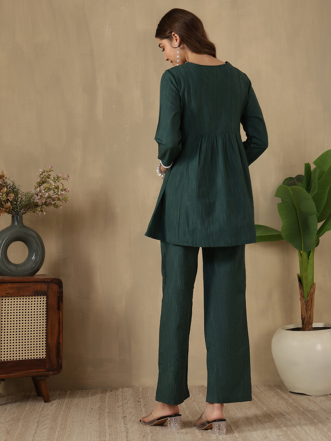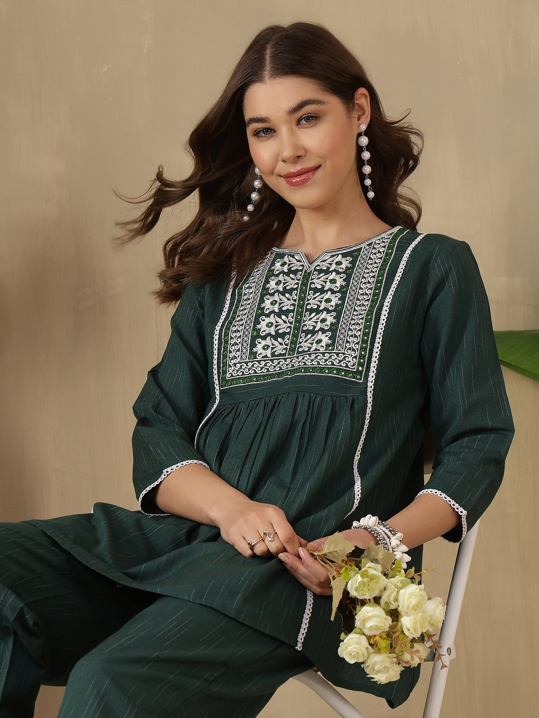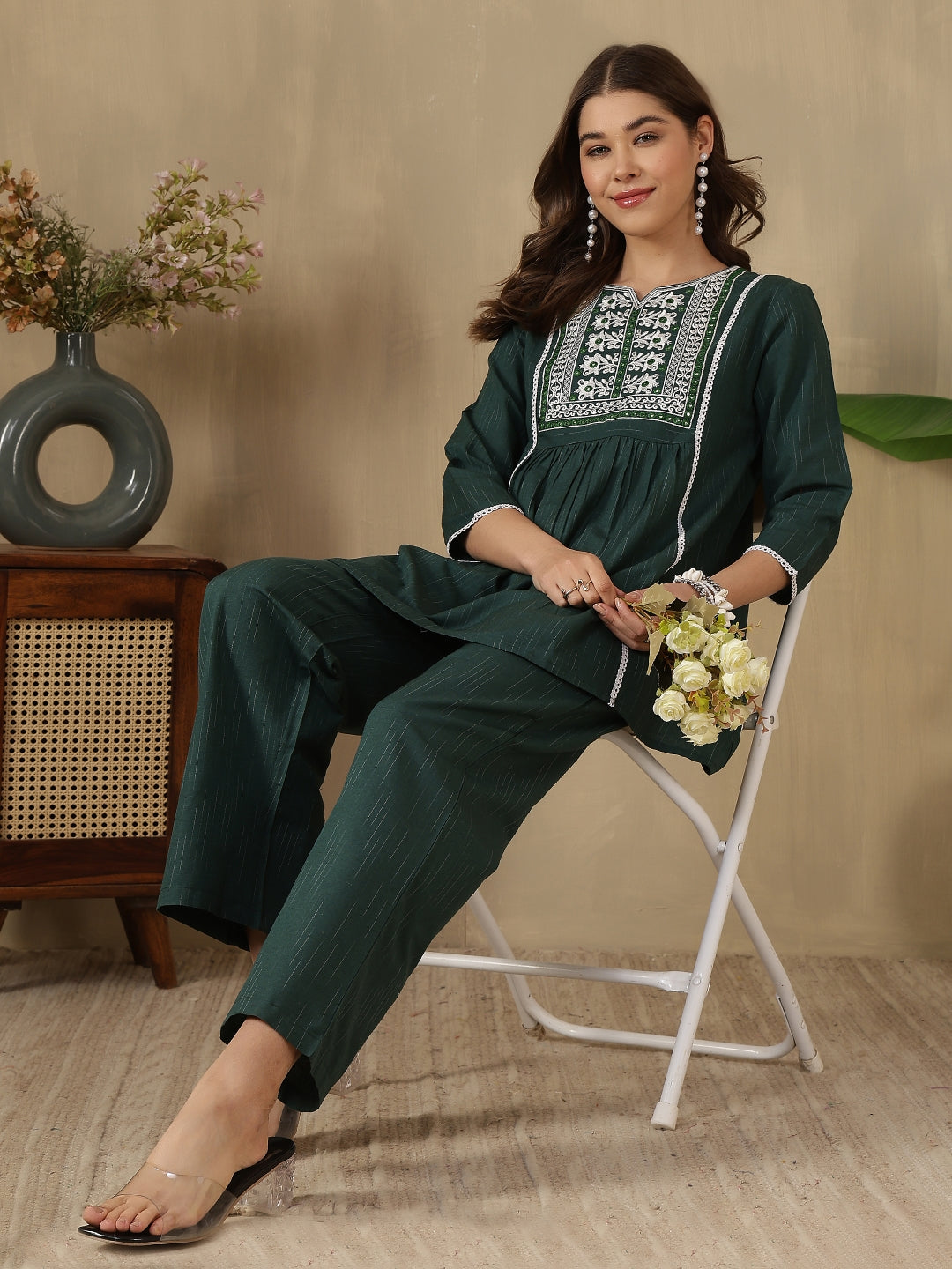 Step out in effortless style with the Green Embroidered Peplum Style Khadi Co-ord Set from Akimia. Crafted with elegant embroidery and a flattering peplum-style top, this outfit brings a perfect blend of comfort and contemporary fashion. The breathable khadi fabric and 3/4 sleeves make it ideal for warm days, while the straight-fit trousers ensure all-day comfort and ease. Perfect for casual outings, brunches, travel, and summer styling.