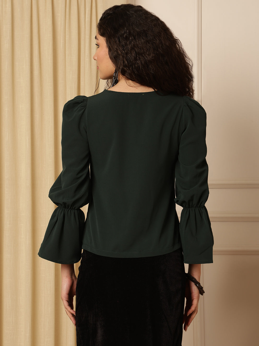 Add a fresh and stylish touch to your wardrobe with this Green Puff Sleeves Solid Blouson Top. Designed with a solid pattern and elegant black lace work, this top offers a chic and sophisticated look. The puff long sleeves and flattering V-neck enhance the overall style, making it perfect for both casual and semi-formal occasions. Easy to style, it pairs beautifully with jeans, trousers, or skirts for everyday fashion.