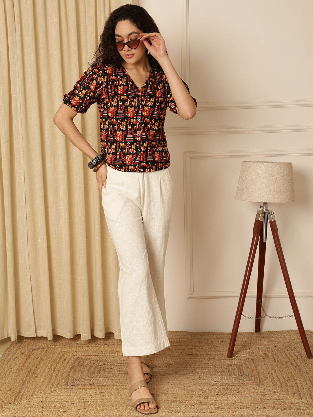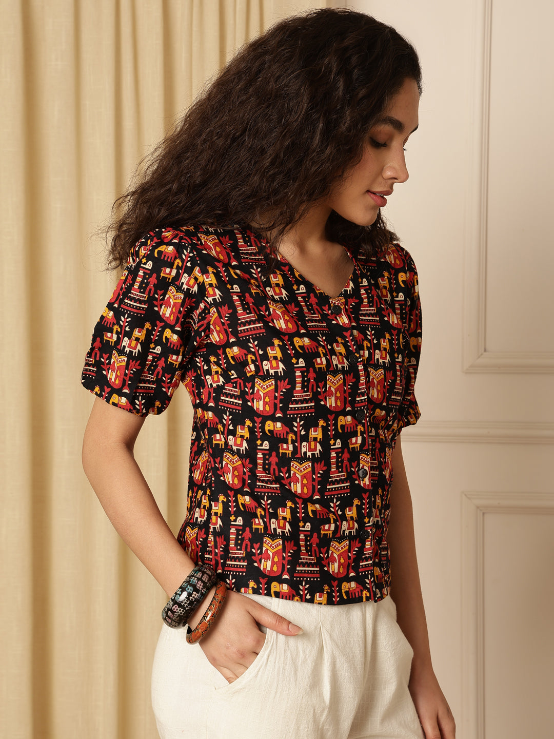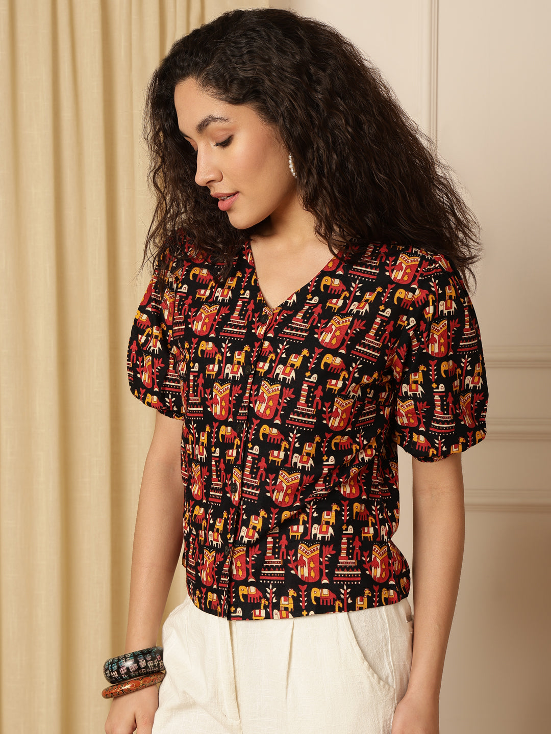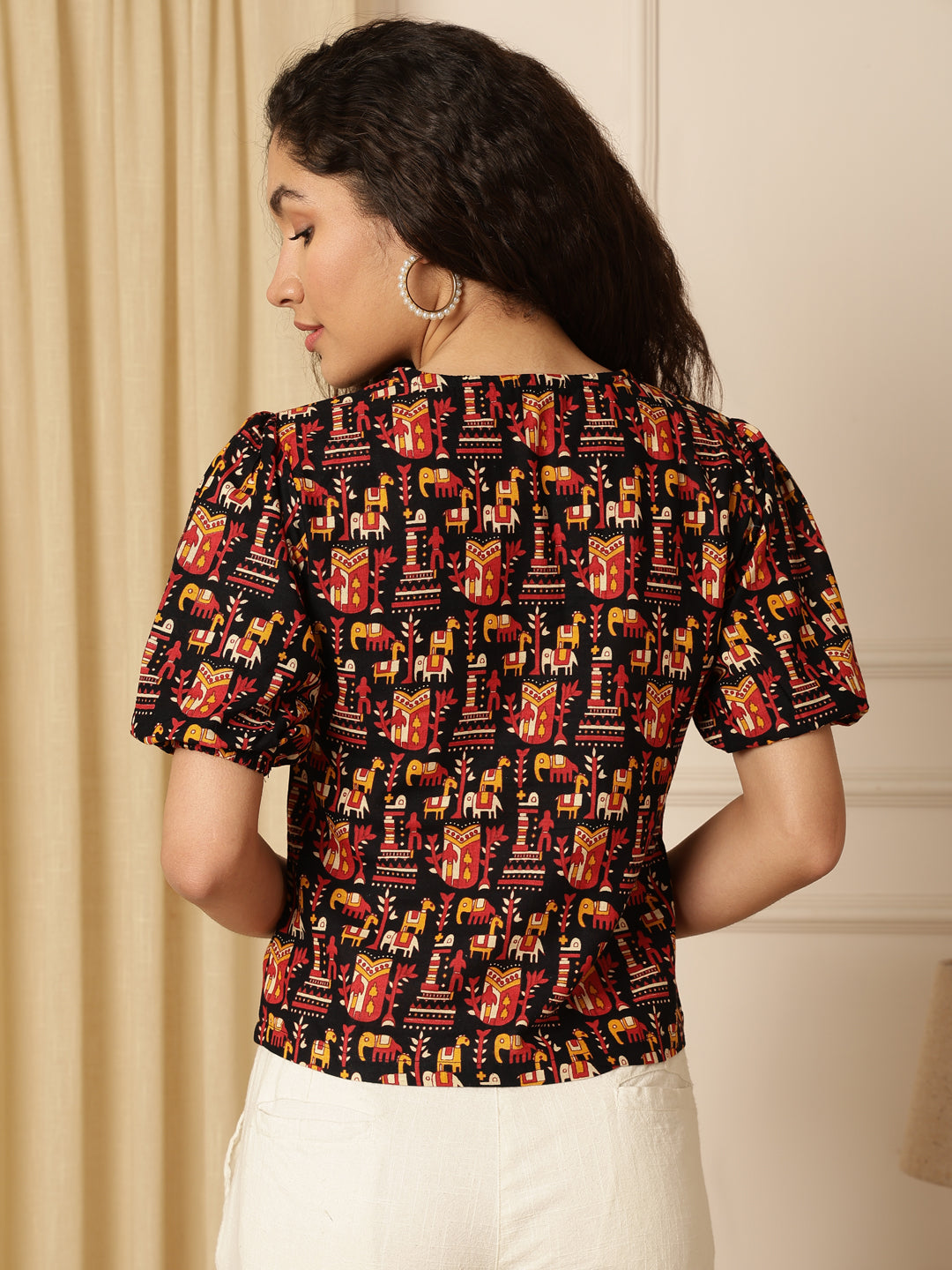 Upgrade your everyday style with the Mraoon Tribal Print Puff Sleeve Cotton Shirt Style Top from Akimia. Made from comfortable cotton fabric, this top features a stylish tribal print, puff short sleeves, and a flattering V-neck with button closure. Perfect for casual outings, office wear, brunches, travel, and summer styling, it offers both comfort and trendy appeal.