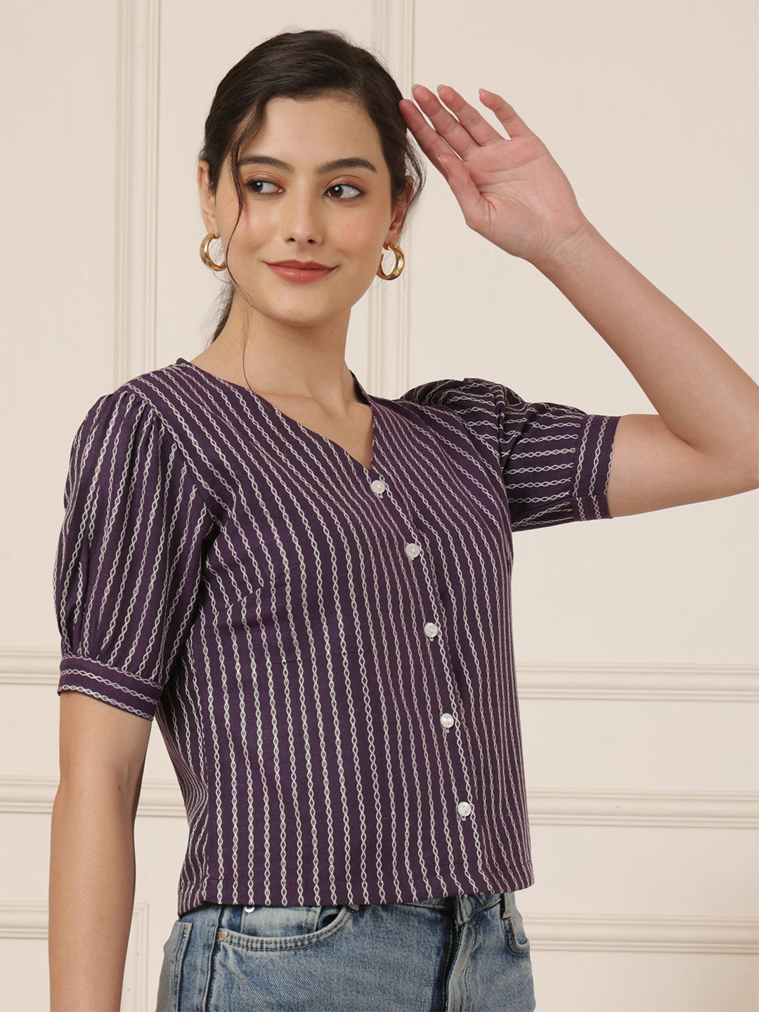 Featuring elegant puff sleeves, this top brings a subtle touch of femininity and volume, creating a balanced and flattering shape. The V-neckline enhances the overall design by offering a clean, modern finish that complements different body types. Finished with a button closure on the front, the top allows for easy wear and versatile styling options.