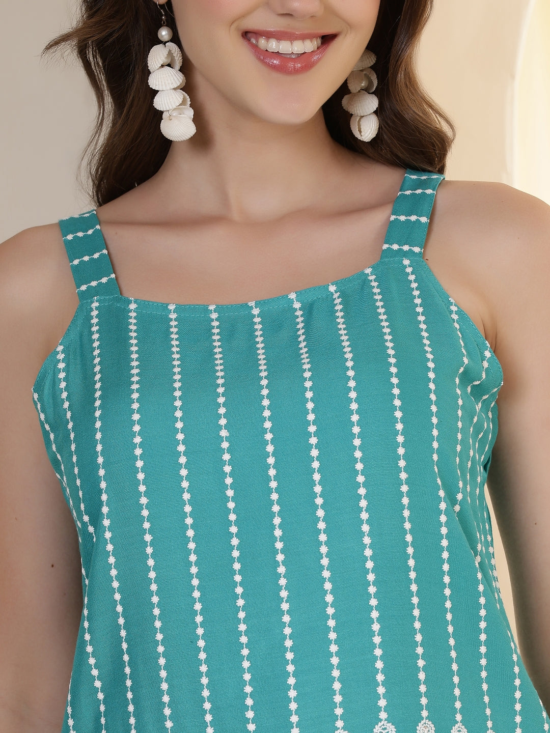Enhance your everyday style with the Turquoise Embroidered Shoulder Straps Kurti from Akimia. Featuring elegant embroidered thread work, this kurti offers a beautiful blend of comfort and style. The square neck and shoulder straps create a modern look, while the side slits add ease of movement. Perfect for casual outings, summer wear, and daily styling.